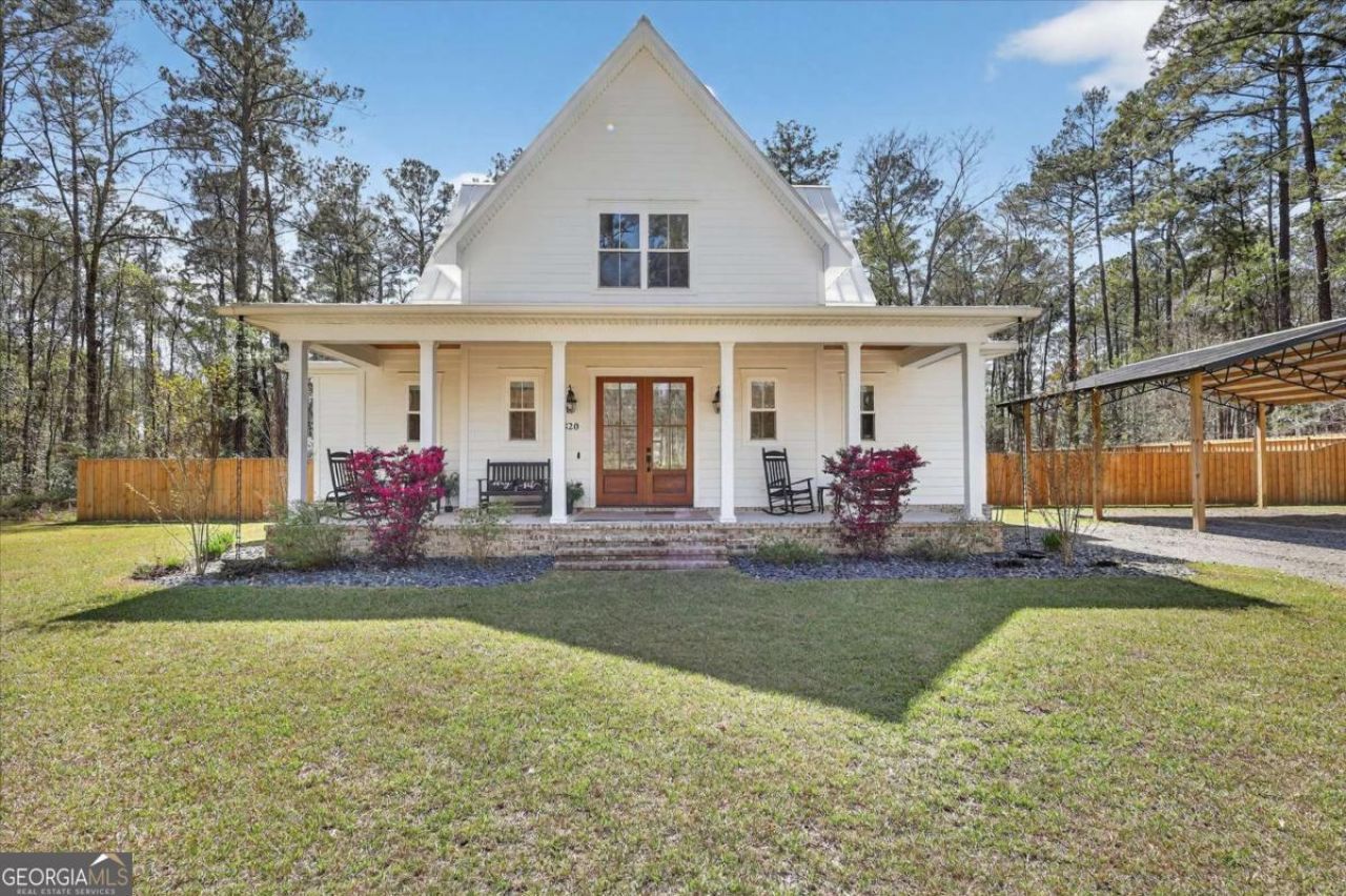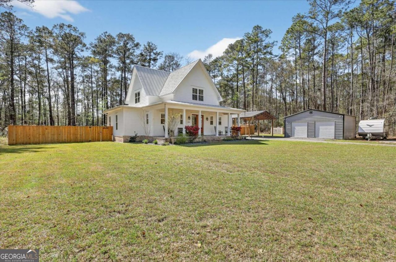 Modern farmhouse with luxury finishes, on over 2 acres of privacy and not a detail missed! This 2,700 sq ft, 4 bed, 4.5 bath on 2.2 serene acres in the heart of Rincon features custom finishes, wood and black accents, LVP flooring throughout and designer tile in wet areas. The kitchen was made for entertaining with a 10' island and level IV quartz surfaces. The brick-accented electric fireplace and exposed wood beam in the family room make a stunning focal point leading to large floor to ceiling glass doors that open to a full view of the property. The thoughtfully designed screened-in back porch spans around the back of the home with tongue-and-groove ceilings, both front and rear. Directly outside the patio is a saltwater spa with dual loungers. The primary suite on the main offers private access to the enclosed back patio, a custom en-suite with dual-head walk-in shower, pedestal tub, double vanity, and a functional walk-in closet with an owner's safe. Upstairs you'll find 3 additional bedrooms, each with their own private full bath. Outside is a newly built shop with 2 bay doors and epoxy flooring, adjacent to an oversized carport for your boat or RV parking, as well as your personal RV hookup. The back yard is fully fenced and equipped with garden beds and chicken coop that come with or without the chickens! Through the side access, you'll find the mud room, walk-in pantry, and washer and dryer. The home is equipped with remote-controlled roll-up blinds in every room, a security system, 24-gauge standing seam metal roof and even rain chains! Call today to see this Lowcountry escape with no HOA or restrictions!